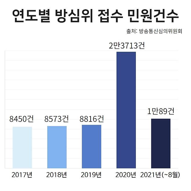 실제로 지상파 콘텐츠에 대한 불만은 급증하는 추세다. 방송통신심의위원회(이하 방심위)에 접수된 민원 건수를 연도별로 살펴보면 ▷2017년 8450건 ▷2018년 8573건 ▷2019년 8816건 ▷2020년 2만3713건이었다. 지난해 폭발적으로 증가했다.