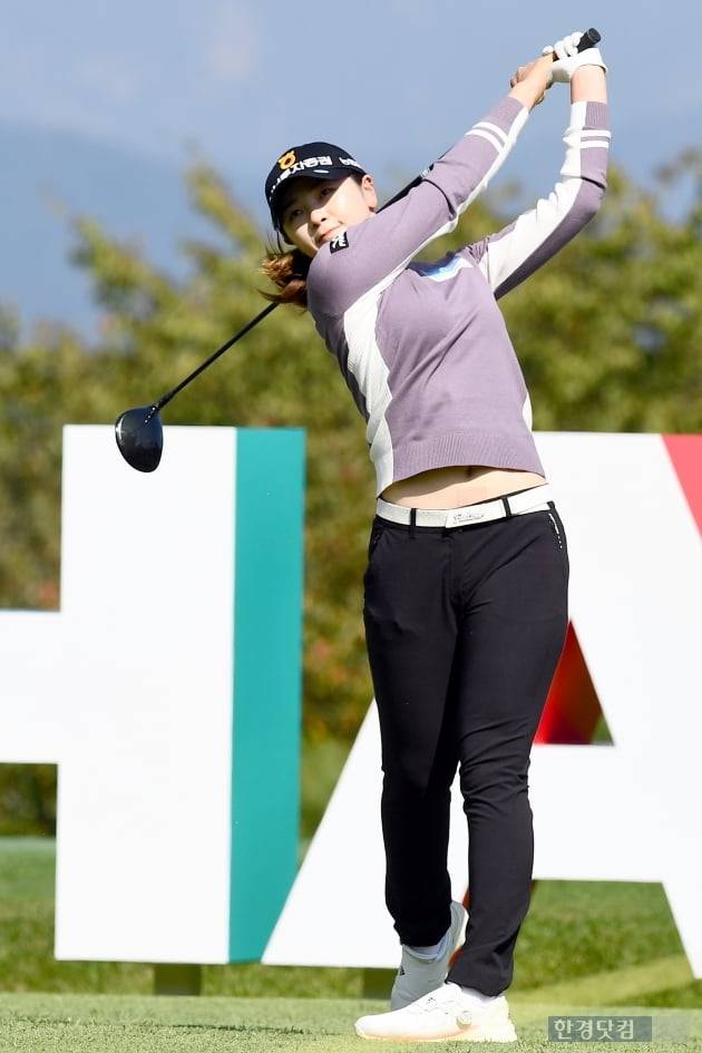 KLPGA(한국여자프로골프)투어 '하나금융그룹 챔피언십'(총상금 15억 원) 1라운드 경기가 30일 경기도 포천시 경기도 포천 아도니스 컨트리클럽(파71·6480야드)에서 열렸다. 대회에 출전한 이가영이 1번 홀에서 티샷하고 있다.