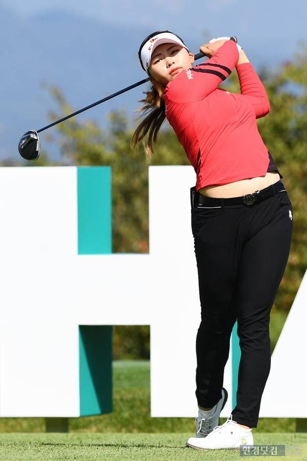 KLPGA(한국여자프로골프)투어 '하나금융그룹 챔피언십'(총상금 15억 원) 1라운드 경기가 30일 경기도 포천시 경기도 포천 아도니스 컨트리클럽(파71·6480야드)에서 열렸다. 대회에 출전한 김지영2이 1번 홀에서 티샷하고 있다.