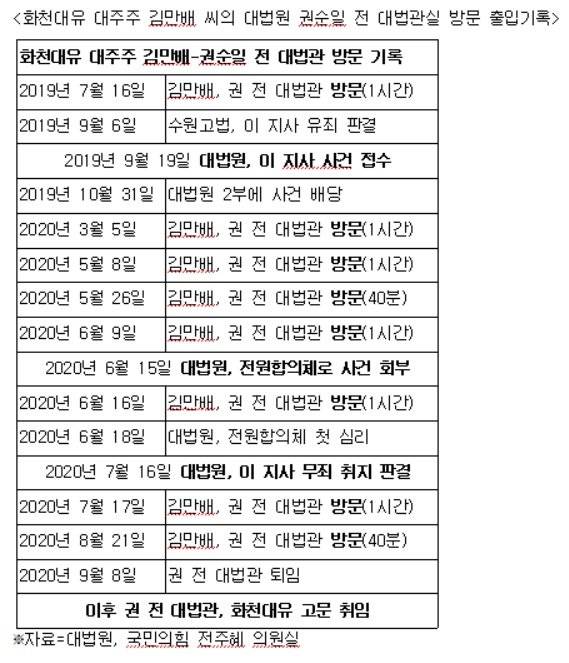 이외에도 김 씨는 지난해 3월 5일, 5월 8일과 26일 권 전 대법관을 방문했다. 김 씨가 지난해 6월 9일 권 전 대법관을 방문한 지 6일 뒤인 6월 15일 대법원은 사건을 전원합의체로 회부했다.