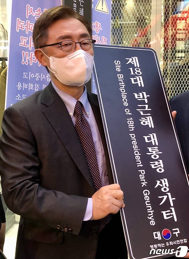(대구=뉴스1) 남승렬 기자 = 국민의힘 대선 주자인 최재형 전 감사원장이 30일 오후 대구 중구 삼덕동 박근혜 전 대통령 생가터를 찾아 현판을 들어보이고 있다. 2021.9.30/뉴스1