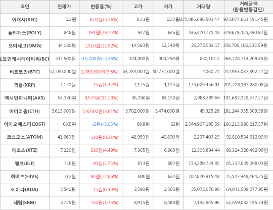 또한, 하이브(12.66%, 712원), 오미세고(11.92%, 14,180원), 엑시인피니티(11.29%, 94,320원), 엘프(5.75%, 736원), 이캐시(5.56%, 0.3원), 테조스(4.49%, 7,220원), 이더리움(3.61%, 3,615,000원), 세럼(1.75%, 8,725원), 리플(1.32%, 1,150원), 에이다(0.59%, 2,540원), 코스모스(0.31%, 41,660원)가 상승세를 나타냈다.