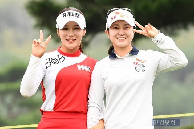 KLPGA(한국여자프로골프)투어 '하나금융그룹 챔피언십'(총상금 15억 원) 1라운드 경기가 30일 경기도 포천시 경기도 포천 아도니스 컨트리클럽(파71·6480야드)에서 열렸다. 대회에 출전한 황정미, 이승연이 10번 홀에서 티샷을 한 후 포즈를 취하고 있다.