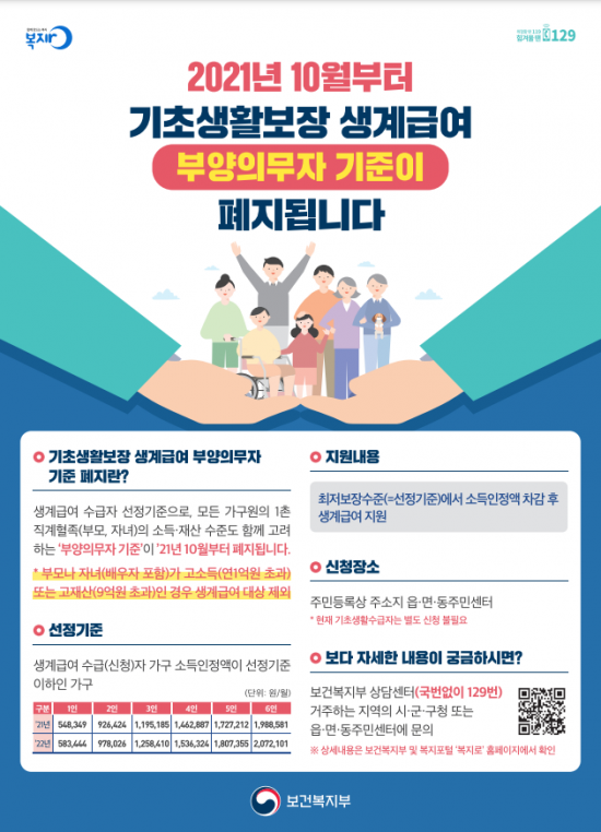 보건복지부는 2022년 1월부터 생계급여 수급자에 대한 부양의무자 기준을 폐지할 예정이었으나, 코로나19 장기화 등의 상황을 고려해 3개월 당겨 시행하기로 했다.