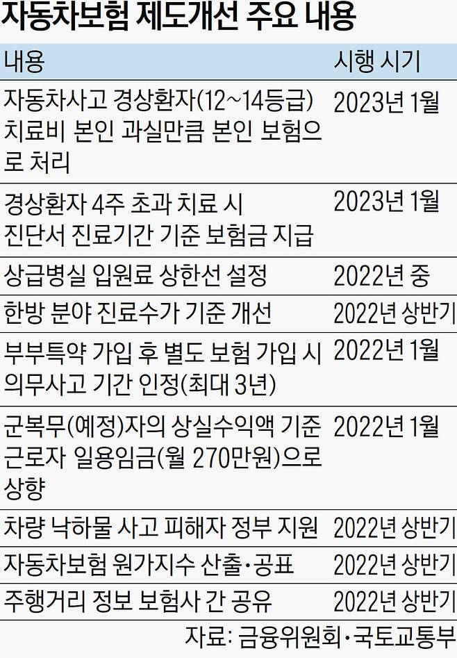 개선안을 보면 교통사고 경상환자(12~14등급)는 본인 과실 치료비를 본인 보험사로 처리해야 한다. 기존에는 과실 비율과 무관하게 상대방 보험사에서 치료비를 지급해왔다. 이 때문에 과실비율이 작은 운전자가 보험금을 더 많이 내는 문제가 발생하기도 했다. 특히 경상환자는 치료기간이 4주를 초과하면 의료기관의 진단서가 있어야 보험금을 받을 수 있도록 했다.