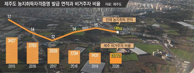 또 농지취득자격증명이 발급된 농지 면적 중 제주 비거주자의 비중은 2015년 17%, 2017년 12%, 2020년 14%로 집계됐다. 다른 지역에 살면서 매입한 농지인 만큼 방치하거나 무단 임대로 연결될 가능성이 많다. 다만 지난해 기준 제주도 전체 농지취득 면적과 제주 비거주자의 취득 면적은 2015년에 비해 각각 59.8%, 66.7% 감소했다. 제주도 관계자는 “2015년부터 제주 비거주자가 농지를 취득할 때는 항공비용, 체재비 등을 포함한 농업경영 소득률을 산출해 일정 이상이 돼야 농업취득자격증명을 발급하고 있다”며 “일반 농지 심사가 강화되다 보니 주말체험농장을 내세운 농지 취득이 보다 늘어난 경향이 있다”고 말했다.