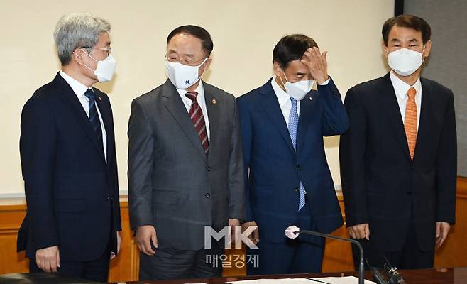 고승범(왼쪽부터) 금융위원장과 홍남기 경제부총리 겸 기획재정부 장관, 이주열 한국은행 총재, 정은보 금융감독원장이 30일 오전 서울 중구 전국은행연합회에서 열린 '거시경제 금융회의'에 참석해 회의 시작 전 대화하고 있다.