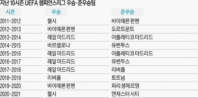 레알 마드리드와 바르셀로나는 2010년대 챔피언스리그를 상징하는 팀이다. 챔피언스리그 최다 우승 기록(13회)을 보유하고 있는 레알 마드리드는 2013~2014시즌 우승에 이어 2015~2016시즌부터 2017~2018시즌까지 3연패를 달성했다.