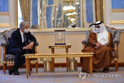 In this photo provided by the Israeli Government Press Office, Israel's Foreign Minister Yair Lapid, left, meet with Bahrain's Crown Prince Salman bin Hamad Al Khalifa, during the first high-level visit to the small Gulf state by a senior Israeli official since the signing of a landmark agreement to establish diplomatic ties between the two countries last year, in Manama, Bahrain, Thursday, Sept. 30, 2021. Lapid will inaugurate Israel’s embassy. (Shlomi Amshalem/GPO via AP) AP PROVIDES ACCESS TO THIS PUBLICLY DISTRIBUTED HANDOUT PHOTO PROVIDED BY THE ISRAELI GOVERNMENT PRESS OFFICE; MANDATORY CREDIT.
