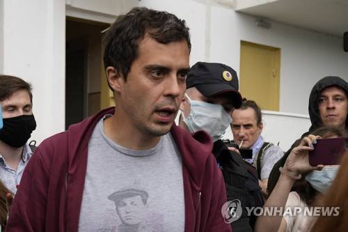 FILE In this file photo taken on Wednesday, July 28, 2021, Roman Dobrokhotov, chief editor of The Insider walks surrounded police officers and journalists, in Moscow, Russia. Russian authorities are seeking to detain prominent investigative journalist, Roman Dobrokhotov, his lawyer says. The move on Thursday Sept. 30, 2021, comes as independent media, opposition supporters and human rights activists are facing increased government pressure. (AP Photo/Alexander Zemlianichenko, File) JULY 28, 2021, FILE PHOTO