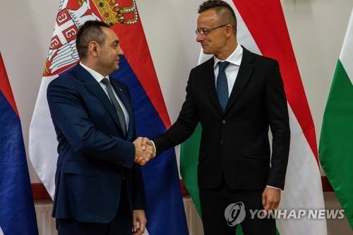 epa09497329 Serbian Interior Minister Aleksandar Vulin (L) shakes hands with Hungarian Minister of Foreign Affairs and Trade Peter Szijjarto during their meeting in Szeged, Hungary, 30 September 2021. The two politicians inaugurated an interconnector between their two countries' gas networks later. EPA/Tibor Rosta HUNGARY OUT