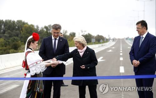epa09497331 President of the European Commission Ursula von der Leyen (2-R), Croatian Prime Minister Andrej Plenkovic (L) and Chairman of the Council of Ministers of Bosnia and Herzegovina, Zoran Tegletija (R) open a border crossing, a bridge over the Sava River between Croatia and Bosnia and Herzegovina at Svilaj town, Croatia, 30 September 2021. EPA/ANTONIO BAT