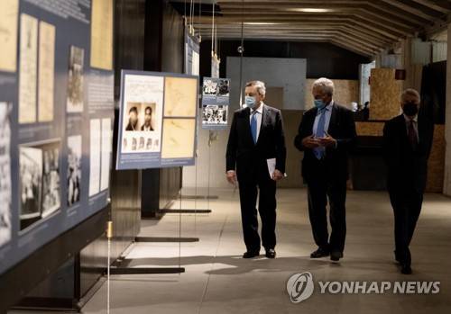 epa09497335 A handout photo made available by the Chigi Palace press office shows Italian Prime Minister Mario Draghi during a visit to the Shoah Memorial, near Milan Central Station, with Italian senator Liliana Segre, survivor of Auschwitz, in Milan, Italy, 30 September 2021. The Memorial is located along track 21 from which, starting in 1943, the convoys with the Milanese Jews destined for the extermination camps left.