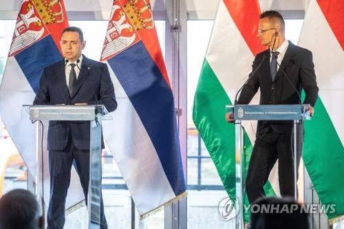 epa09497353 Serbian Interior Minister Aleksandar Vulin (L) speaks as Hungarian Minister of Foreign Affairs and Trade Peter Szijjarto looks on during a press conference during the ceremonial inauguration of an interconnector between their two countries' gas networks in Kiskundorozsma, Hungary, 30 September 2021. EPA/Tibor Rosta HUNGARY OUT