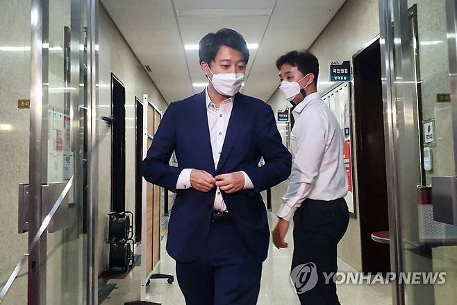 (서울=연합뉴스) 홍준석 기자 = 국민의힘 이준석 대표가 30일 밤 서울 여의도 국회에서 긴급 최고위원회의를 마치고 나오고 있다. 2021.9.30
