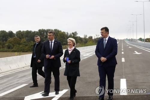 epa09497355 President of the European Commission Ursula von der Leyen (C), Croatian Prime Minister Andrej Plenkovic (L) and Chairman of the Council of Ministers of Bosnia and Herzegovina, Zoran Tegletija (R) open a new border crossing, a bridge over the Sava River between Croatia and Bosnia and Herzegovina at Svilaj town, Croatia, 30 September 2021. EPA/ANTONIO BAT