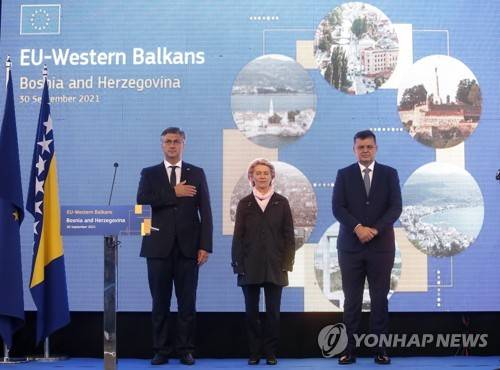 epa09497357 President of the European Commission Ursula von der Leyen (C), Croatian Prime Minister Andrej Plenkovic (L) and Chairman of the Council of Ministers of Bosnia and Herzegovina, Zoran Tegletija (R) during a ceremony to open a new border crossing, a bridge over the Sava River between Croatia and Bosnia and Herzegovina at Svilaj town, Croatia, 30 September 2021. EPA/ANTONIO BAT