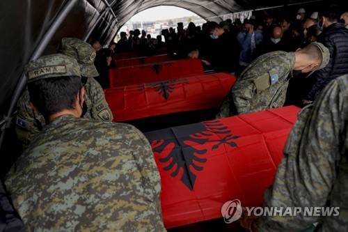 epa09497363 Soldiers of the Kosovo Security Force (KSF) carry coffins with remains of the Kosovo Albanian victims of the Rezalla massacre, exhumed from the mass grave in the Serbia's town of Kizevak, at the border crossing in Merdare, Kosovo, 30 September 2021. More than 1600 persons, most of them Albanians, are still listed missing from the 1998-99 war. EPA/VALDRIN XHEMAJ