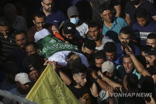 Mourners chant Islamic slogans while carrying the body of Mohammed Abu Ammar during his funeral along the streets of Bureij refugee camp, central Gaza Strip, Thursday, Sept. 30, 2021. Israeli troops shot and killed Abu Ammar, a 40-year-old Palestinian man, on Thursday as he was setting bird traps in the Gaza Strip near the Israeli border, his family said. The military said it was investigating. (AP Photo/Adel Hana)