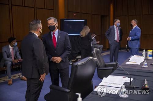epa09497389 Secretary of Health and Human Services Xavier Becerra (2-L), talking with Democratic Senator from New Mexico Ben Ray Lujan (L) and Secretary of Education Miguel Cardona (R), talking with Democratic Senator from Colorado John Hickenlooper (2-R), prepare to testify during the Senate Health, Education, Labor, and Pensions Committee hearing to discuss reopening schools during Covid-19 on Capitol Hill in Washington, DC, USA, 30 September 2021. EPA/SHAWN THEW