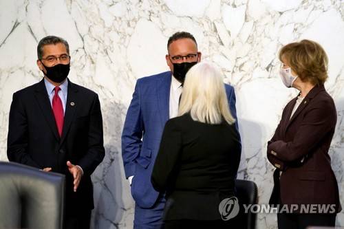 epa09497395 (L-R) Secretary of Health and Human Services Xavier Becerra and Secretary of Education Miguel Cardona speak to Sens. Patty Murray (D-Wash.) and Tina Smith (D-Minn.) before a Senate Health, Education, Labor, and Pensions Committee hearing to discuss reopening schools during Covid-19 on Capitol Hill in Washington, DC, USA, 30 September 2021. EPA/Greg Nash / POOL
