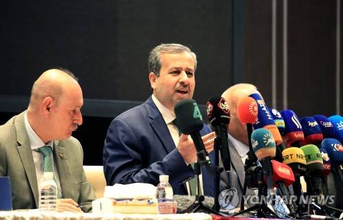 epa09497397 The chairman of the Iraqi Independent High Electoral Commission Judge Jaleel Adnan (C), speaks during a press conference in Baghdad, Iraq on 30 September 2021. Adnan said during the press conference , that more than 21 million Iraqis, who have registered and received their voter cards, are entitled to vote in the parliamentary elections, and the United Nations has a group of 130 international experts and around 600 support staff will monitoring the elections. EPA/AHMED JALIL