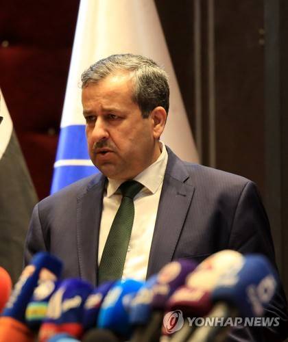 epa09497400 The chairman of the Iraqi Independent High Electoral Commission Judge Jaleel Adnan (C), speaks during a press conference in Baghdad, Iraq on 30 September 2021. Adnan said during the press conference , that more than 21 million Iraqis, who have registered and received their voter cards, are entitled to vote in the parliamentary elections, and the United Nations has a group of 130 international experts and around 600 support staff will monitoring the elections. EPA/AHMED JALIL
