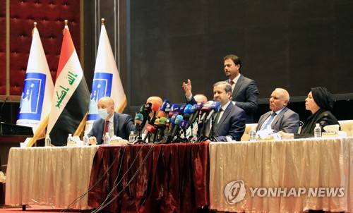 epa09497401 Members of the Iraqi Independent High Electoral Commission Judge Jaleel Adnan during a press conference in Baghdad, Iraq on 30 September 2021. The chairman of the Iraqi Independent High Electoral Commission Judge Jaleel Adnan said during the press conference , that more than 21 million Iraqis, who have registered and received their voter cards, are entitled to vote in the parliamentary elections, and the United Nations has a group of 130 international experts and around 600 support staff will monitoring the elections. EPA/AHMED JALIL