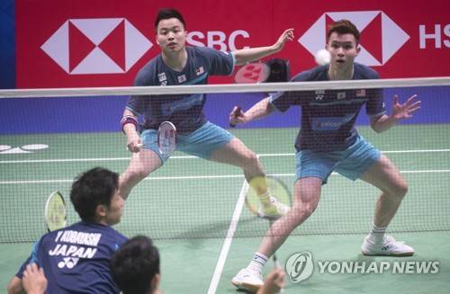epa09497413 Takuro Hoki and Yugo Kobayashi of Japan (front) and Aaron Chia and Soh Wool Yik of Malaysia in action during the men's doubles game of the group stage tie between China and Thailand at the BWF 2021 Sudirman Cup Badminton tournament in Vantaa, Finland, 30 September 2021. EPA/MAURI RATILAINEN
