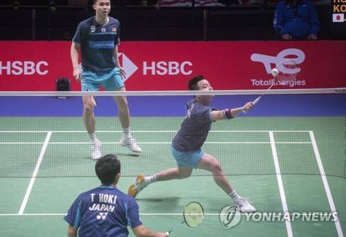 epa09497414 Takuro Hoki and Yugo Kobayashi of Japan (front) and Aaron Chia and Soh Wool Yik of Malaysia in action during the men's doubles game of the group stage tie between China and Thailand at the BWF 2021 Sudirman Cup Badminton tournament in Vantaa, Finland, 30 September 2021. EPA/MAURI RATILAINEN