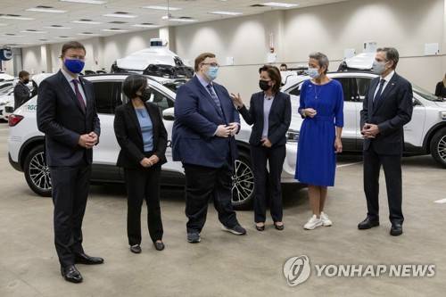 From left, European Commissioner Valdis Dombrovskis, U.S. Trade Representative Katherine Tai, ARGO CEO Bryan Salesky, Commerce Secretary Gina Raimondo, European Commissioner Margrethe Vestager and Secretary of State Antony Blinken, talk as they pose for photos on a tour of the ARGO facility during a meeting of the United States-European Union Trade and Technology Council (TTC), Thursday, Sept. 30, 2021, in Pittsburgh. (AP Photo/Rebecca Droke, Pool) POOL IMAGE