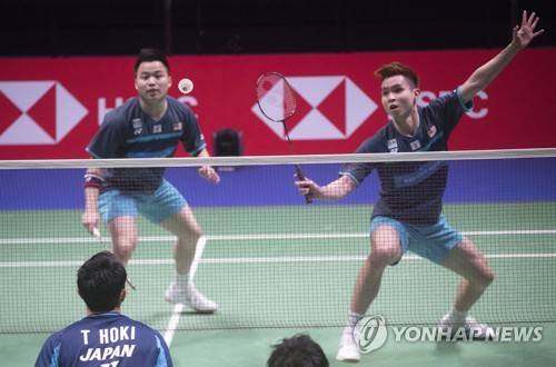 epa09497415 Takuro Hoki and Yugo Kobayashi of Japan (front) and Aaron Chia and Soh Wool Yik of Malaysia in action during the men's doubles game of the group stage tie between China and Thailand at the BWF 2021 Sudirman Cup Badminton tournament in Vantaa, Finland, 30 September 2021. EPA/MAURI RATILAINEN