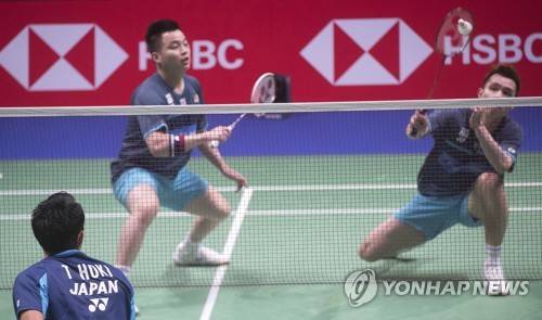 epa09497412 Takuro Hoki and Yugo Kobayashi of Japan (front) and Aaron Chia and Soh Wool Yik of Malaysia in action during the men's doubles game of the group stage tie between China and Thailand at the BWF 2021 Sudirman Cup Badminton tournament in Vantaa, Finland, 30 September 2021. EPA/MAURI RATILAINEN