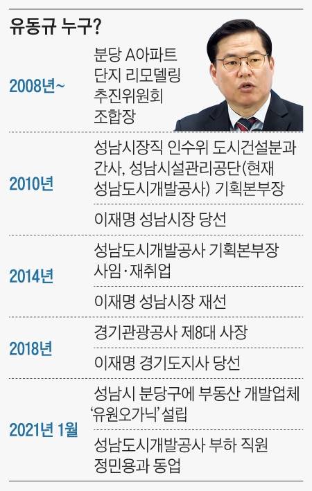 유동규씨는 화천대유가 자산관리사(AMC)로 참여한 ‘성남의뜰’ 컨소시엄이 우선협상대상자로 선정될 때 성남도시개발공사 사장 직무대리였다. 성남도시개발공사 초대 사장인 황모씨가 1년가량 재임하고 스스로 물러나자 실권자인 유씨가 대장동 개발 계획을 진두지휘했다. 그는 2018년 행정안전부 장관 표창을 받을 때 공적 조서에 ‘대장동 개발’을 기재한 것으로 확인됐다고 국민의힘 이영 의원이 밝혔다.
