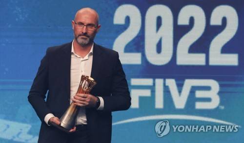 epa09497968 The general manager of the Russian national volleyball team Sergei holds the trophy of the 2022 FIVB Volleyball Men's World Championship during the draw ceremony of the 2022 FIVB Volleyball Men's World Championship in Moscow, Russia, 30 September 2021. The FIVB 2022 Volleyball World Championship takes place in Russia from 26 August to 11 September 2022. World Cup matches will be held in ten Russian cities: Moscow, St. Petersburg, Kaliningrad, Yaroslavl, Kazan, Ufa, Yekaterinburg, Novosibirsk, Kemerovo and Krasnoyarsk. EPA/Yuri Kochetkov