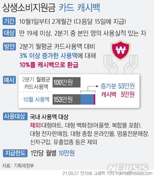 [세종=뉴시스] 이승재 기자 = 이달부터 두 달간 2분기보다 돈을 더 많이 쓴 사람에게 매달 10만원씩 돌려주는 '상생소비지원금'(카드 캐시백) 사업이 시작된다.