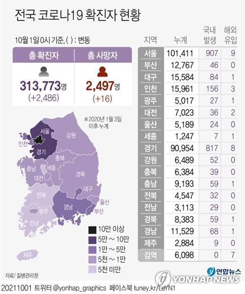 (서울=연합뉴스) 장예진 기자 = 중앙방역대책본부는 1일 0시 기준으로 신규 확진자가 2천486명 늘어 누적 확진자가 31만3천773명을 기록했다고 밝혔다.