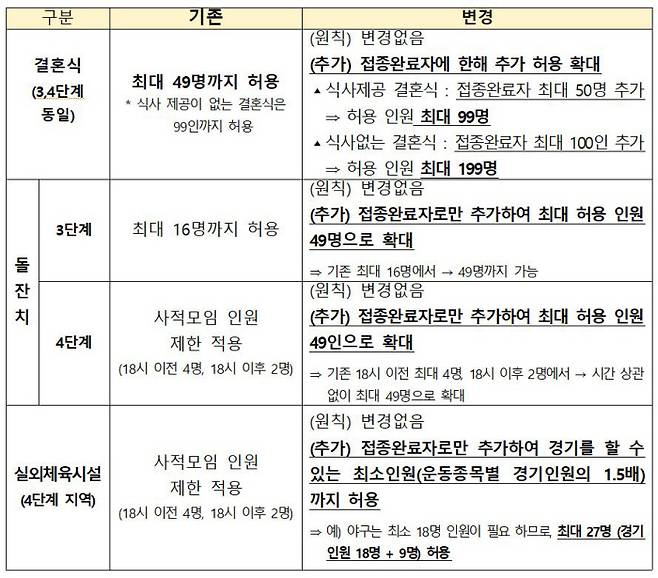 돌잔치는 접종완료자로만 인원을 추가하면 최대 49명까지 허용한다. 이전까지는 3단계에서 최대 16명까지, 4단계에서는 사적모임 인원제한 범위 내에서 열 수 있었다. 3단계에서는 기존 허용인원 16명에 접종완료자 33명을 추가하면 최대 49명이 참여할 수 있다. 4단계의 경우 저녁 6시 이전 사적모임 가능 인원 4명(6시 이후 2명)에 접종완료자 45명(6시 이후 47명)을 추가하면 최대 49명까지 가능하다.