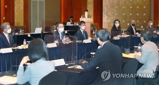 (서울=연합뉴스) 문승욱 산업통상자원부 장관(뒷줄 왼쪽 두 번째)이 1일 오전 서울 소공동 롯데호텔에서 열린 알키미스트 프로젝트 그랜드챌린지위원회 킥오프 회의에 참석해 인사말을 하고 있다. 2021.10.1
