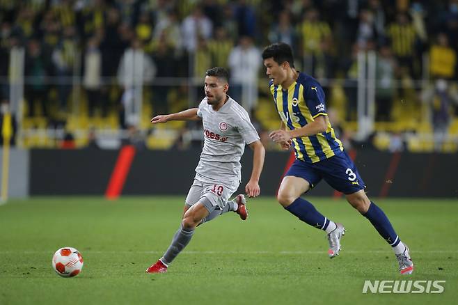 [이스탄불=AP/뉴시스] 페네르바체의 김민재(오른쪽)가 9월30일(현지시간) 터키 이스탄불의 수크루 사라코글루 경기장에서 열린 2021-22시즌 유럽축구연맹(UEFA) 유로파리그 D조 조별리그 2차전 올림피아코스와의 경기에 선발 출장해 공을 다투고 있다. 김민재는 풀타임을 뛰며 분전했으나 팀은 0-3으로 패했다. 2021.10.01.