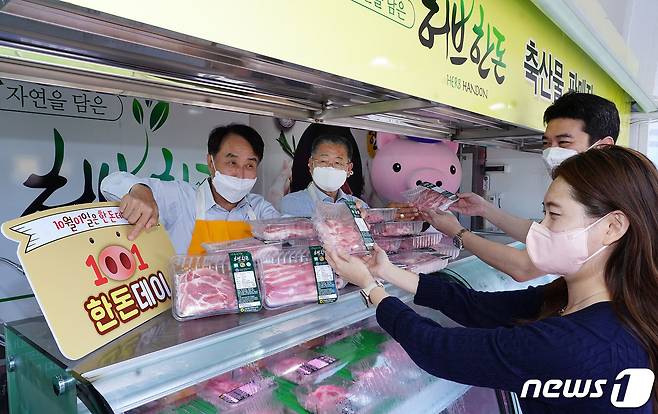 한돈자조금관리위원회는 이날 제8회 한돈데이를 맞아 농협경제지주와 함께 안성팜랜드에서 한돈꾸러미 워크스루 할인판매 행사를 진행한다. (한돈자조금 제공) 2021.10.1/뉴스1