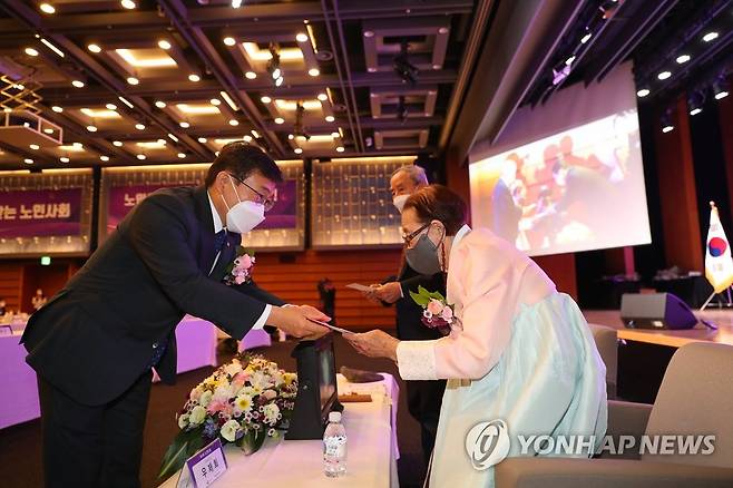 (서울=연합뉴스) 권덕철 보건복지부 장관이 1일 서울 중구 대한상공회의소에서 열린 제25회 노인의 날 기념식에서 100세 어르신인 우제희 씨에게 문재인 대통령 내외의 축하 카드를 전달하고 있다. 2021.10.1