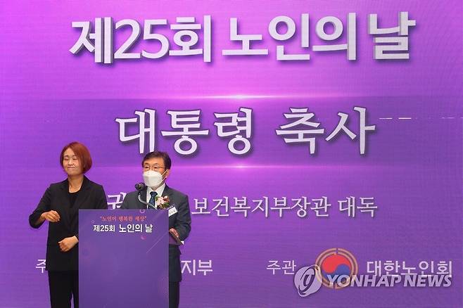 (서울=연합뉴스) 권덕철 보건복지부 장관이 1일 서울 중구 대한상공회의소에서 열린 제25회 노인의 날 기념식에서 문재인 대통령의 축사를 대독하고 있다. 2021.10.1