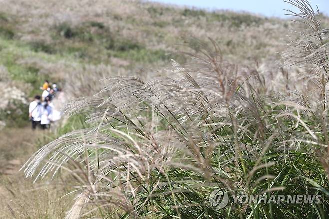 (제주=연합뉴스) 박지호 기자 = 1일 제주시 애월읍 봉성리 새별오름을 찾은 관광객이 은빛 억새 물결 사이를 걷고 있다. 2021.10.1