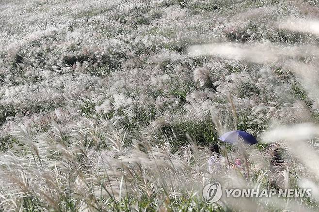 (제주=연합뉴스) 박지호 기자 = 1일 제주시 애월읍 봉성리 새별오름을 찾은 관광객이 은빛 억새 물결 사이를 걷고 있다. 2021.10.1
