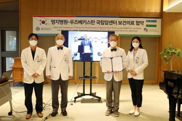 협약식은 9월29일 오후 명지병원 뉴호라이즌힐링센터에서 온라인을 통해 비대면으로 진행했다. 명지병원에서 김세철 의료원장과 정진호 국제진료부원장 등이 참석했으며 우즈벡 국립암센터에서는 틸랴샤이코프 미르자갈예브 원장과 관계자가 참석했다.