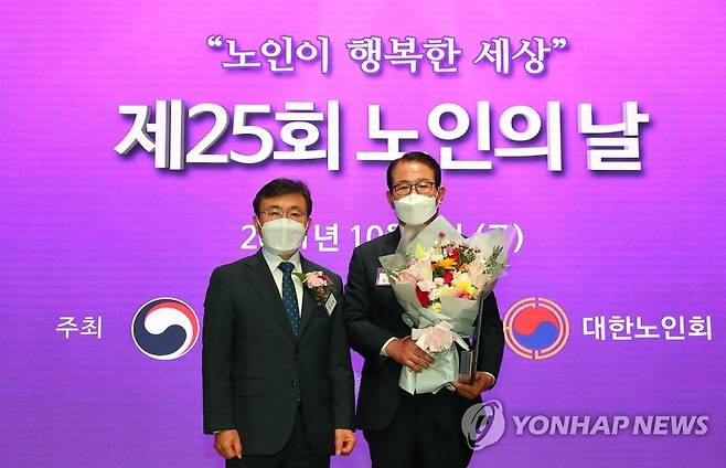 (서울=연합뉴스) 권덕철 보건복지부 장관(왼쪽)이 1일 서울 중구 대한상공회의소에서 열린 제25회 노인의 날 기념식에서 김형두 대한노인회 의정부시지회 지회장에게 국민훈장 석류장을 수여하고 기념 촬영을 하고 있다. 2021.10.1