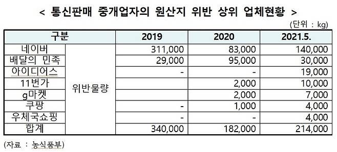네이버, 최근 3년 농수산물 원산지 표시 위반 물량 1위