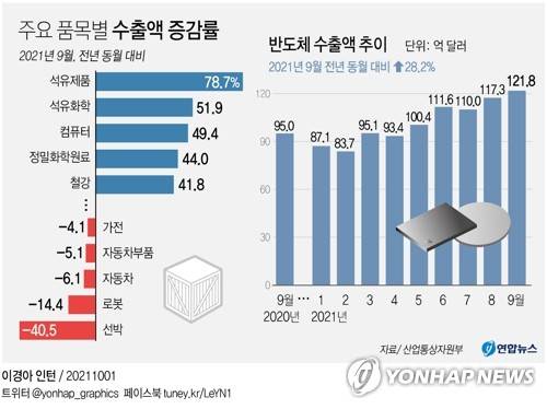 (서울=연합뉴스) 이재윤 기자 = 1일 산업통상자원부가 발표한 9월 수출이 새 기록을 세울 수 있었던 것은 조업일수 부족 여파로 자동차 등 일부 품목이 고전했음에도 반도체, 석유화학, 일반기계 등 다른 주력 품목이 앞에서 끌어준 덕분이다.