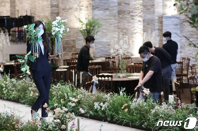 (수원=뉴스1) 김영운 기자 = 방역 당국이 현 거리두기 체계를 2주 더 연장하기로 발표한 1일 오후 경기도 수원시의 한 예식장에서 직원들이 예식 준비를 하고 있다. 이번 발표에 따르면 결혼식은 현재 3~4단계에서 결혼식당 최대 49명, 식사를 제공하지 않는 경우 최대 99명까지 허용하고 있으나, 접종 완료자로만 인원을 추가하여 최대 99명(기존 49명 + 접종 완료자 50명), 식사를 제공하지 않는 경우 역시 접종 완료자로만 인원을 추가해 최대 199명(기존 99명 + 완료자 100명)까지 허용된다. 2021.10.1/뉴스1